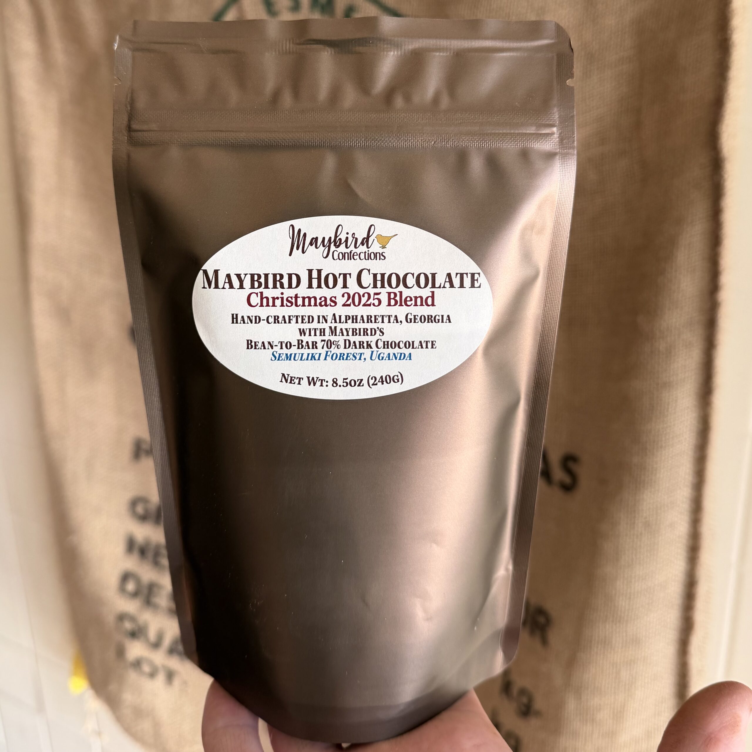 Maybird’s official hot chocolate blend, exactly as served at the 2025 Atlanta Christkindl Market, and exactly as served in our home for years. Made with dark chocolate crafted at the Maybird Kitchen in Alpharetta, Georgia from a delicious crop of organically grown cacao beans from Semuliki, Uganda, along with organic sugar, organic cocoa powder, and Himalayan pink salt. We roast, crack, winnow, and stone-grind the cocoa beans in our melangers, adding nothing but organic cane sugar, and wait u til it turns into a rich dark chocolate. We then transfer the chocolate from the melangers onto sheet pans, spreading it untempered in thin sheets to achieve a crumbly texture. We grind up our freshly made chocolate until it is no larger than pea gravel, then perform another round in the food processor with our precise recipe of cocoa powder, sugar, and salt added. Once we have thoroughly mixed the chocolate and broken down the grains of sugar, it is ready to be packaged and made into hot chocolate! Our hot chocolate mix is all made in Alpharetta in micro-batches, blending the powder up 2kg at a time. This hot chocolate is made with love by people who are passionate about chocolate, and is sure to warm the spirit even on the coldest of nights.